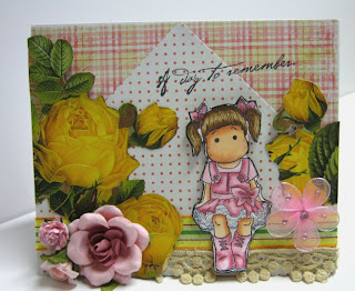 You have seen this adorable Tilda before- I always love to color her in Pinks. I just had to use a couple sheets of some fun Prima paper to start the base design.